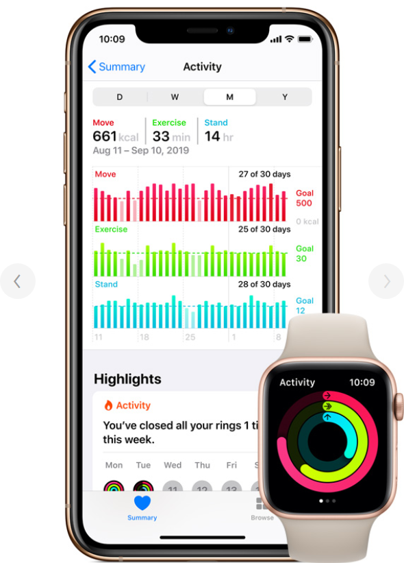 Các vòng Hoạt động theo dõi tiến trình của bạn và truyền cảm hứng cho bạn ngồi ít hơn, di chuyển nhiều hơn và tập thể dục mỗi ngày. Bạn thậm chí có thể cạnh tranh với bạn bè bằng cách tạo ra các chương trình thử thách.