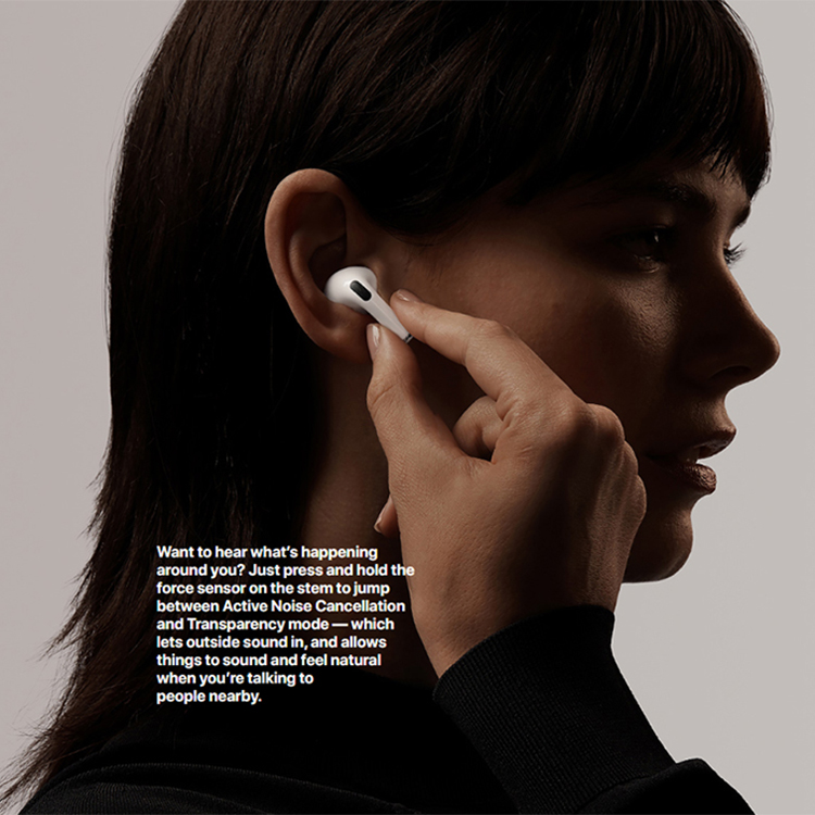 Một tính năng thông minh của AirPods Pro đó chỉnh là sử chuyển đổi giữa chế độ khử tiếng ồn chủ động và chế độ trong suốt. Với những lúc bạn có nhu cầu nghe cả những âm thanh đang xảy ra xung quanh. Việc đơn giản bạn cần làm là nhấn giữ cảm biến lực trên thân tai nghe để chuyển đổi giữa hai chế độ. Với chế độ trong suốt, bạn có thể nghe được cùng lúc âm thanh bên trong cũng như âm thanh bên ngoài, thoải mái nói chuyện với mọi người xung quanh.