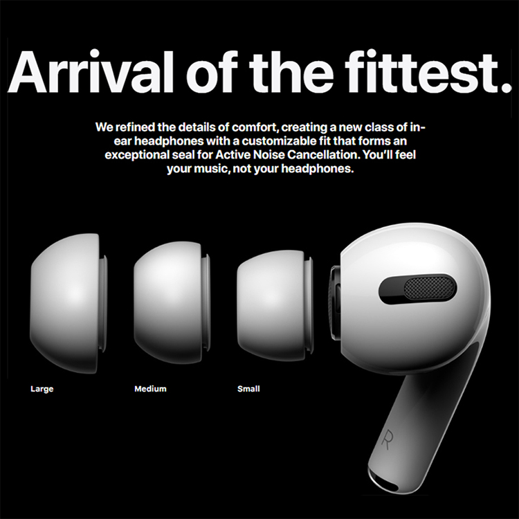 Cùng với 3 mút silicon mềm giúp AirPods Pro không chỉ giúp tai nghe trở nên sang trọng hơn và còn giúp tai nghe bám chắc vào tai, khả năng cách âm tốt cũng như phù hợp với nhiều kích thước tai khác nhau.