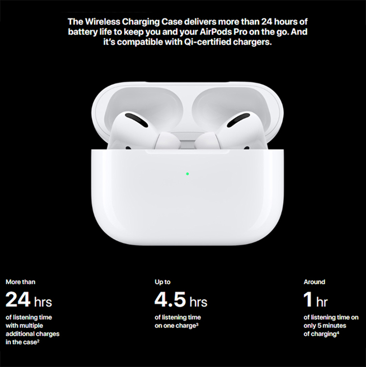 Với AirPods Pro với dung lượng pin cho thời gian sử dụng khá ấn tượng. Cụ thể với 1 lần sạc, tai nghe không dây AirPods Pro cho 4,5 giờ nghe nhạc, 3.5 tiếng đàm thoại. Ngoài ra, hộp sạc không dây giúp lưu trữ điện năng bổ sung năng lượng cho 24 giờ nghe nhạc, 18 giờ đàm thoại.