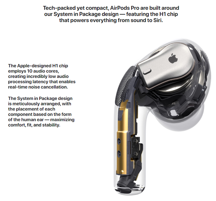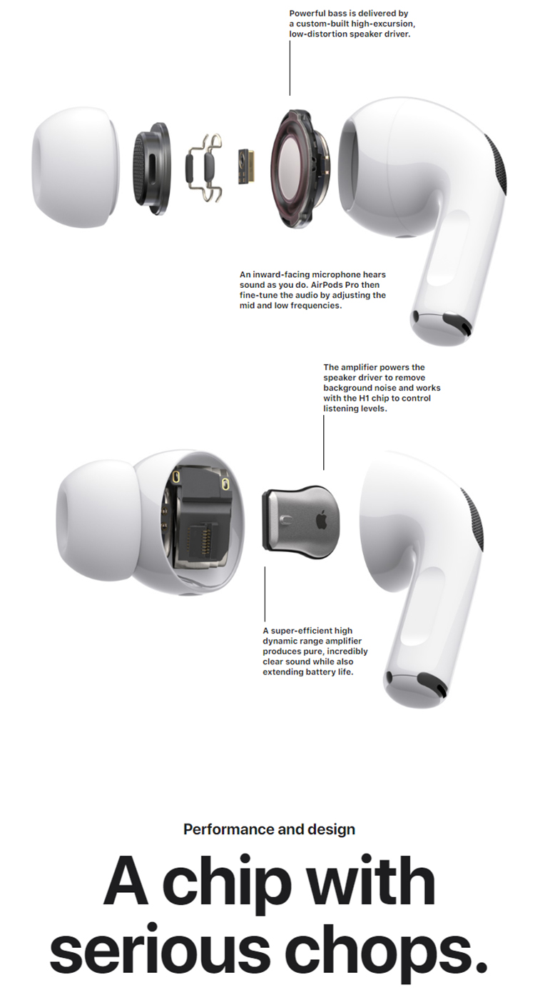 Ngoài ra, Apple AirPods Pro còn bộ khuếch đại cấp nguồn kết hợp với chip H1 giúp loại bỏ nền nhiễu, kiểm soát mức độ nghe. Bộ khuếch đại dải động giúp tạo ra âm thanh thuần khiết, rõ ràng cùng khả năng kéo dài tuổi thọ pin. Hơn thế nữa, tai nghe bluetooth AirPods Pro còn sở hữu cổng micro lưới mở rộng giúp cải thiện độ rõ của cuộc gọi, âm thanh trong các tình huống gió.
