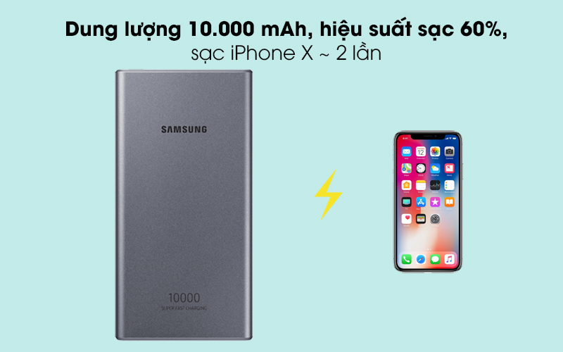 Chứa đựng 1 nguồn năng lượng lớn, Samsung EB-P3300 cho phép bạn sạc được nhiều thiết bị hoặc sạc 1 thiết bị nhiều lần với hiệu suất đến 60%, có thể nạp pin cho iPhone X khoảng 2 lần.