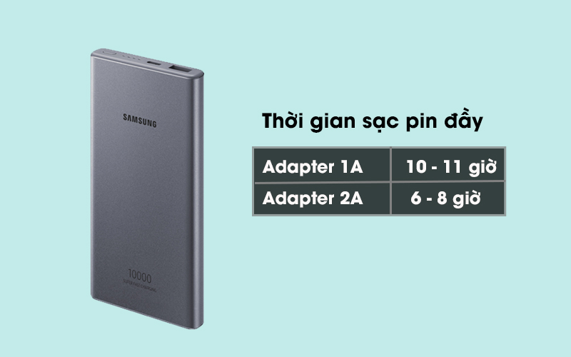 Khi sạc lại cho sạc dự phòng, thời gian sạc đầy 10 - 11 giờ (dùng adapter 1A) và tầm 6 - 8 giờ (dùng adapter 2A).